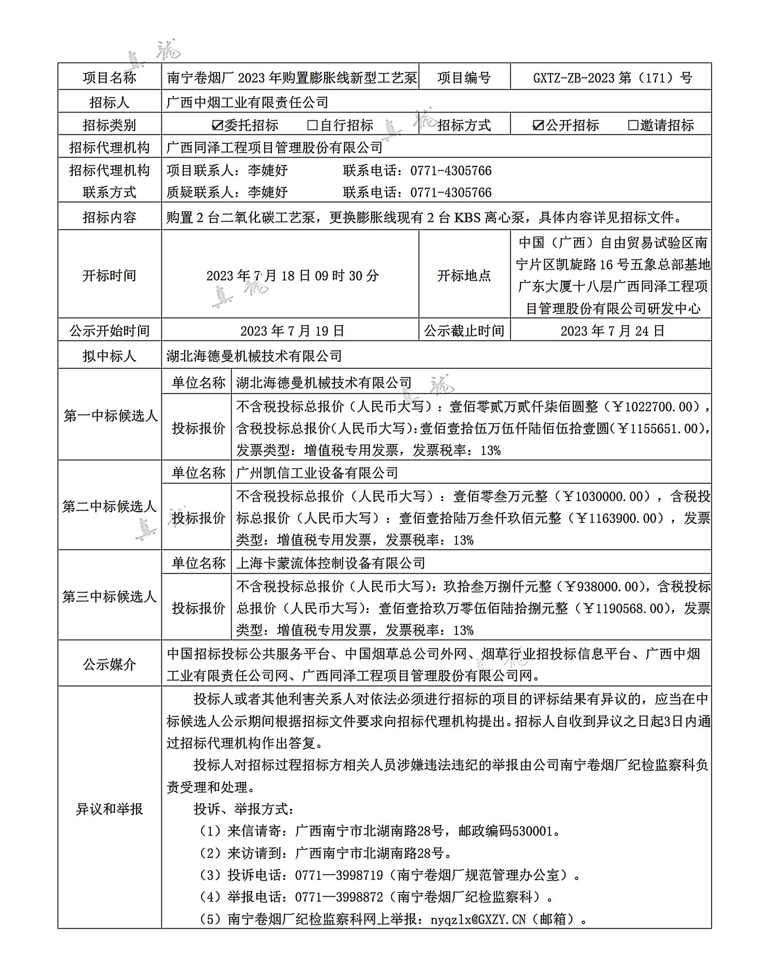 廣西中煙工業(yè)有限責(zé)任公司南寧卷煙廠2023年購置膨脹線新型工藝泵(項(xiàng)目編號(hào):GXTZ-ZB-2023第(171)號(hào))中標(biāo)候選人公示