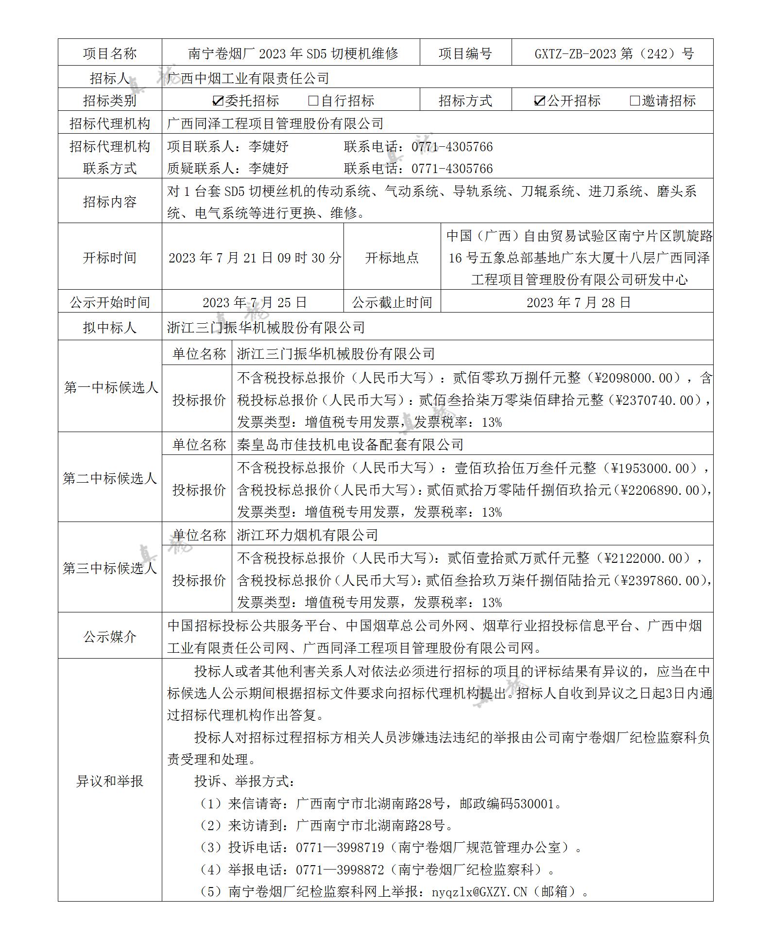 廣西中煙工業(yè)有限責(zé)任公司南寧卷煙廠2023年SD5切梗機(jī)維修(項(xiàng)目編號:GXTZ-ZB-2023第(242)號)中標(biāo)候選人公示