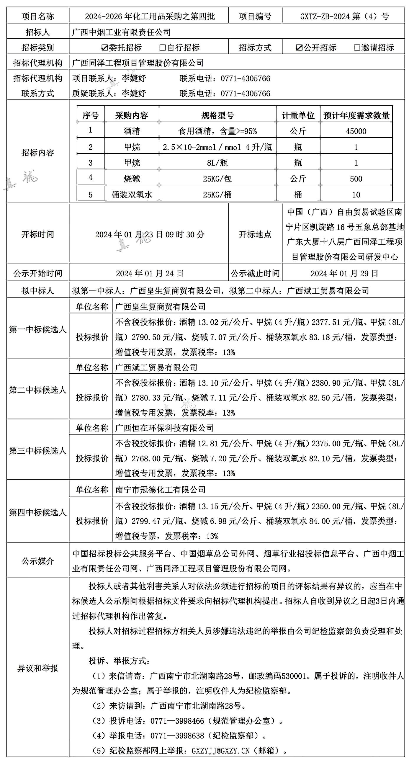 廣西中煙工業(yè)有限責(zé)任公司2024-2026年化工用品采購之第四批(項目編號:GXTZ-ZB-2024第(4)號)中標(biāo)候選人公示