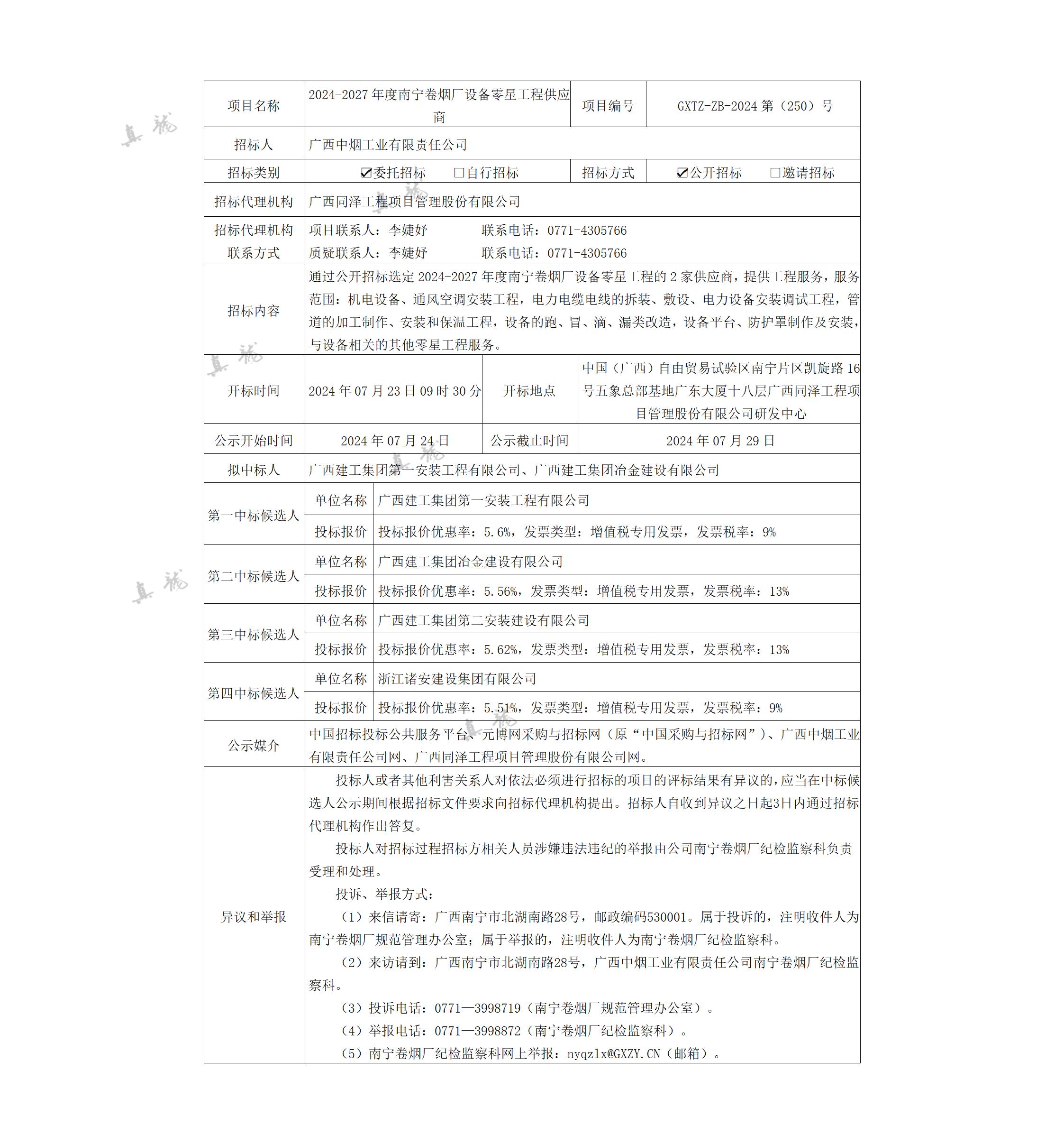 廣西中煙工業(yè)有限責(zé)任公司2024-2027年度南寧卷煙廠設(shè)備零星工程供應(yīng)商(項(xiàng)目編號:GXTZ-ZB-2024第(250)號)中標(biāo)候選人公示