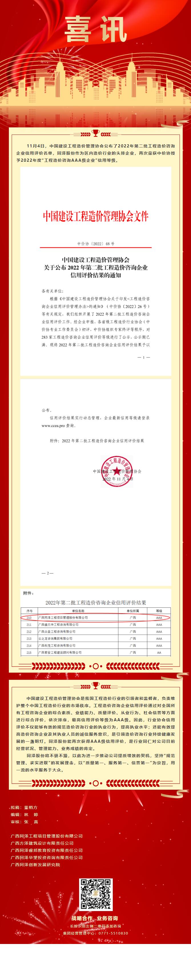喜訊丨同澤股份榮獲中價(jià)協(xié)授予2022年度“工程造價(jià)咨詢AAA級(jí)企業(yè)”信用等級(jí)